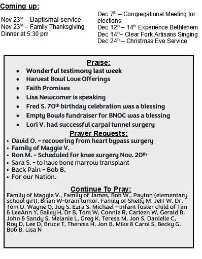 Bulletin for November 16, 2025 Sunday, November 16, 2025 2:30 AM 11:59 PM 02:30 23:59 Clear Fork Alliance Church 1008 Ohio 97 Bellville, OH, 44813 United States (map) Google Calendar ICS