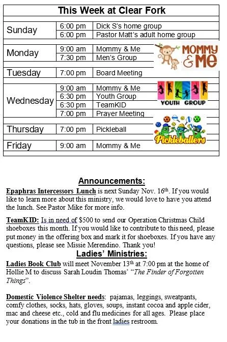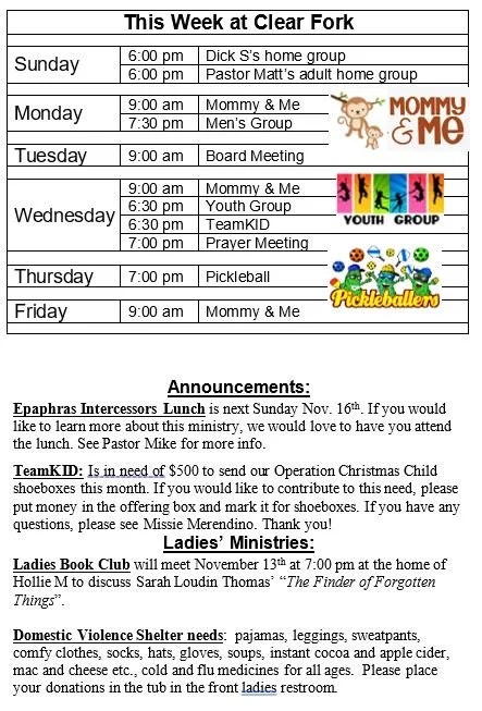 Bulletin for November 9, 2025 Sunday, November 9, 2025 2:30 AM 11:59 PM 02:30 23:59 Clear Fork Alliance Church 1008 Ohio 97 Bellville, OH, 44813 United States (map) Google Calendar ICS