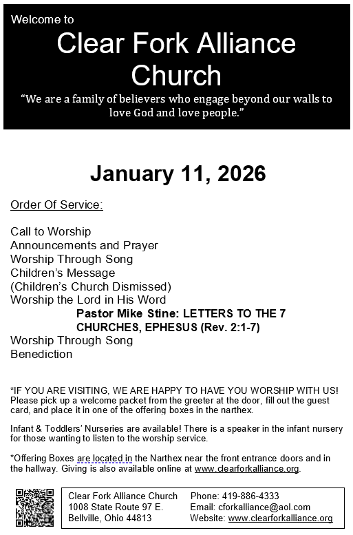 Bulletin for January 11, 2026 Sunday, January 11, 2026 2:30 AM 11:59 PM 02:30 23:59 Clear Fork Alliance Church 1008 Ohio 97 Bellville, OH, 44813 United States (map) Google Calendar ICS