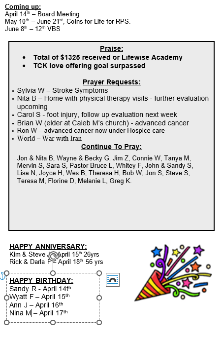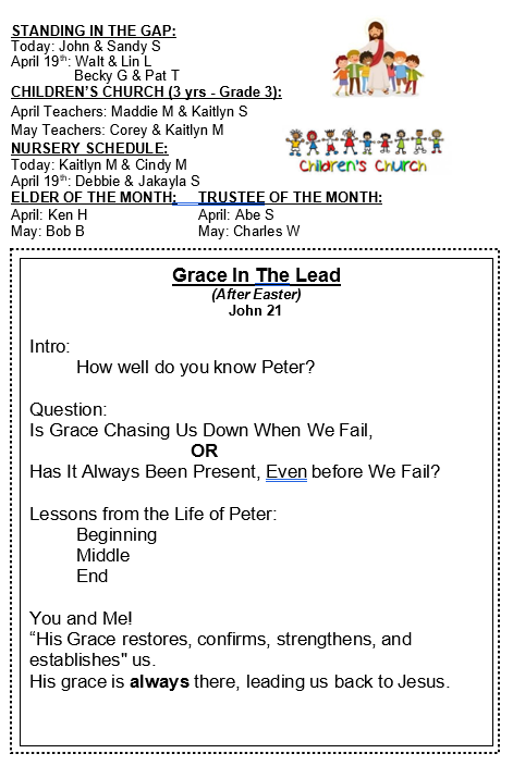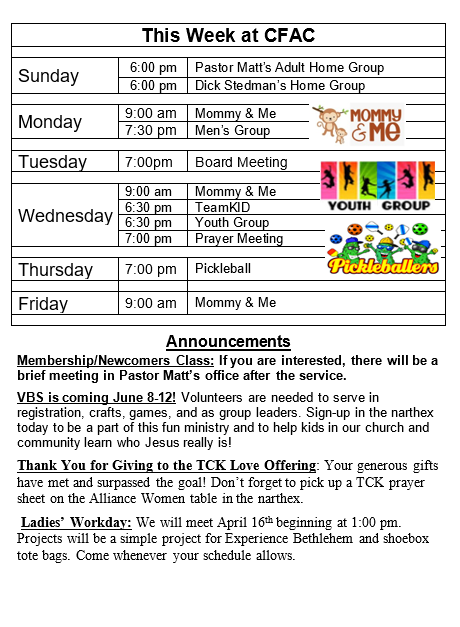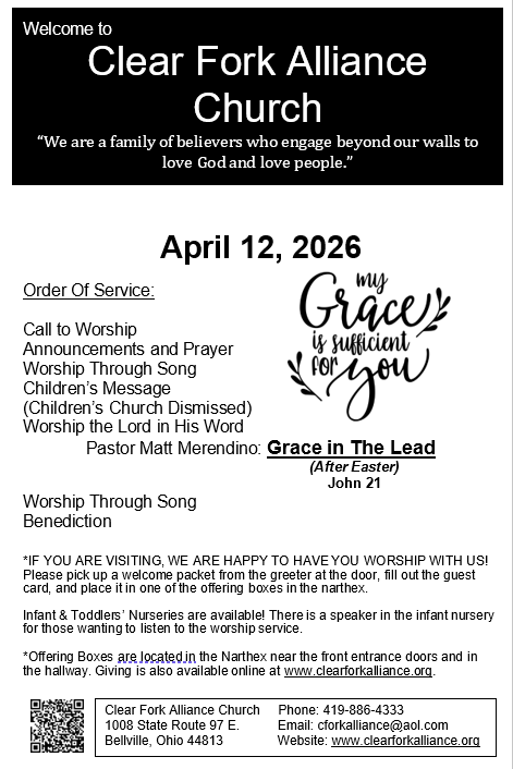 Bulletin for April 12, 2026 Sunday, April 12, 2026 1:30 AM 10:59 PM 01:30 22:59 Clear Fork Alliance Church 1008 Ohio 97 Bellville, OH, 44813 United States (map) Google Calendar ICS