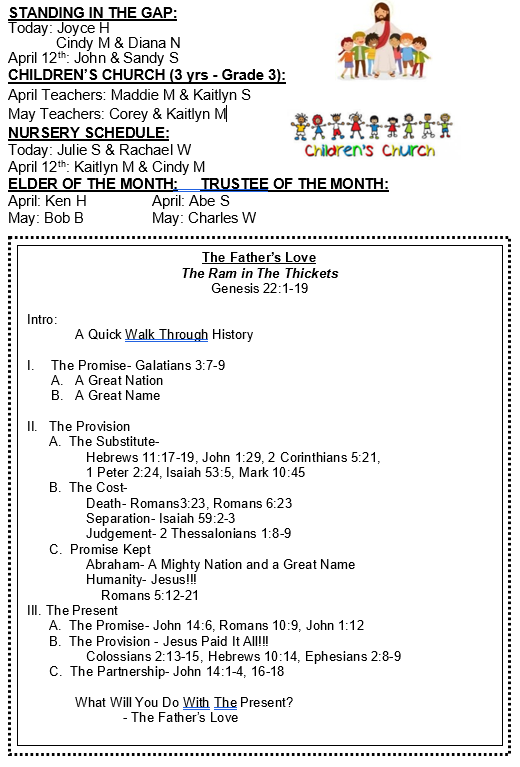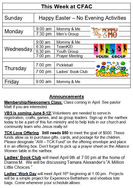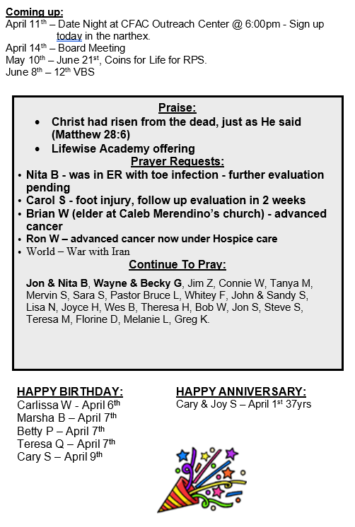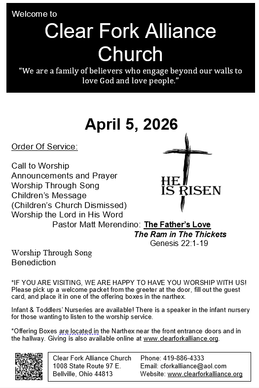 Bulletin for April 5, 2026 Sunday, April 5, 2026 1:30 AM 10:59 PM 01:30 22:59 Clear Fork Alliance Church 1008 Ohio 97 Bellville, OH, 44813 United States (map) Google Calendar ICS